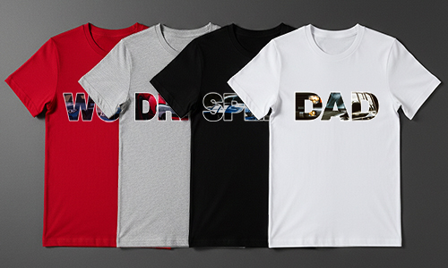 Vier T-Shirts auf Bügeln: MOM in Weiß, RED in Grau, DAD in Schwarz, WOW in Rot, große grafische Schriftzüge